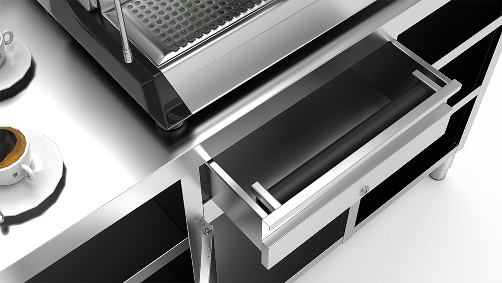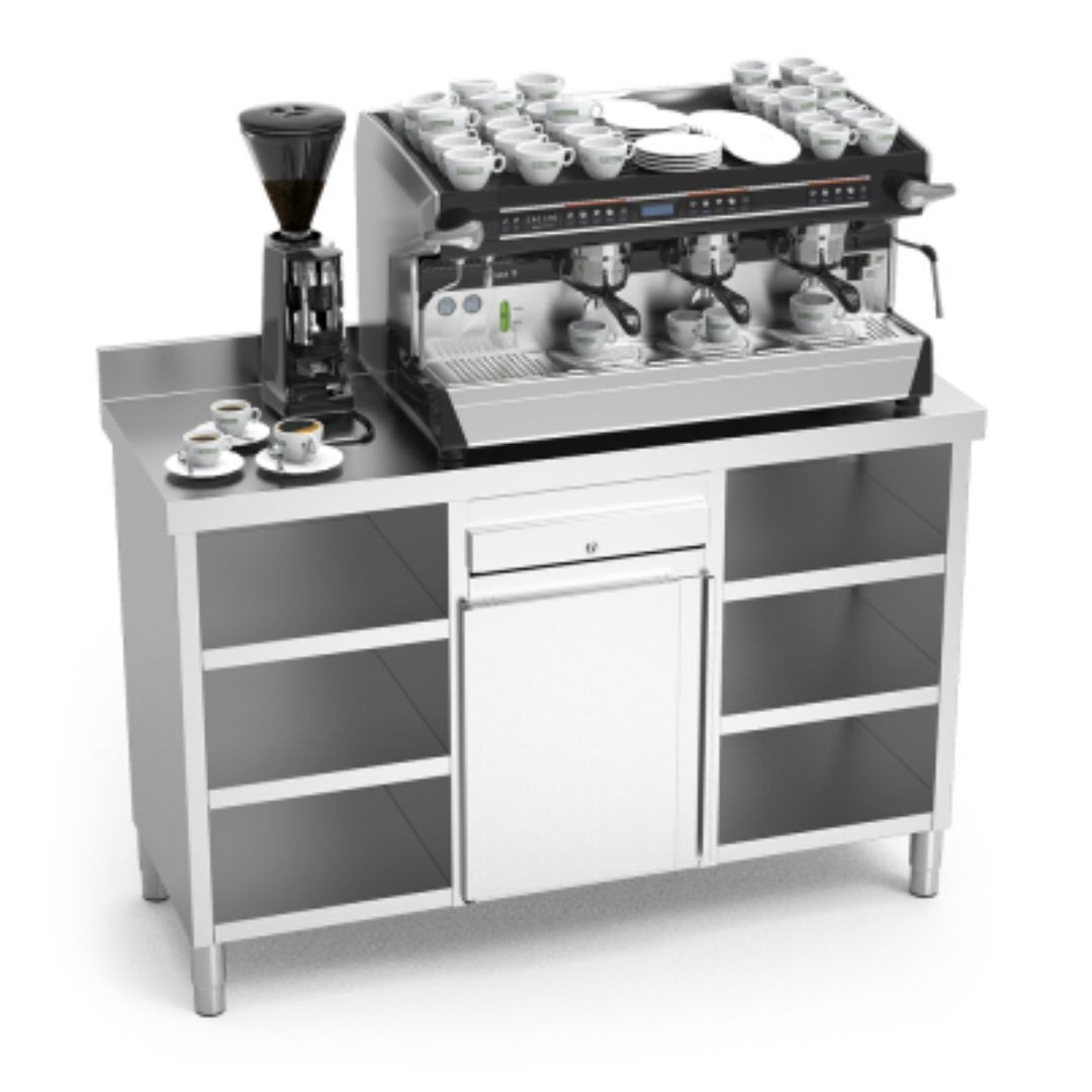 Meubles spéciaux pour les double café, complètement fabriqués en acier inoxydable.