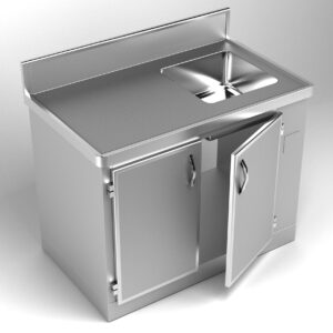 • Évier fabriqué en acier inoxydable AISI-304 18/10 avec dossier arrière de 100 mm et avant 50 mm d’un point rond, totalement des soldats.
