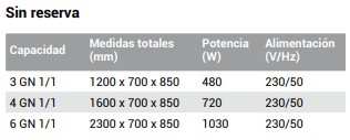 1200 x 700 x 850 mm, 1600 x 700 x 850 mm, 2300 x 700 x 850 mm, 1600 x 700 x 850 mm (avec réserve réfrigérée), 2300 x 700 x 850 mm (avec réserve réfrigérée)