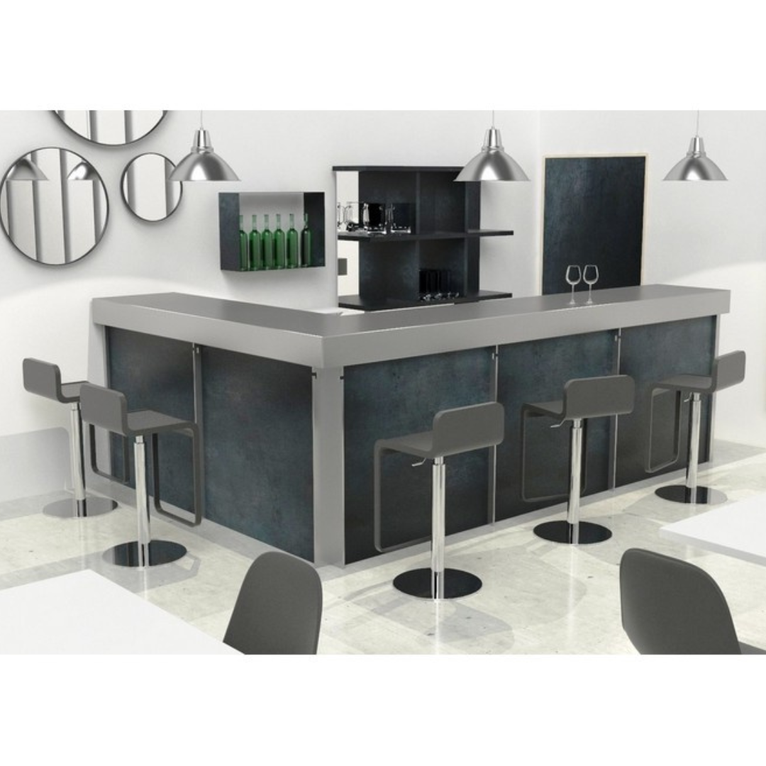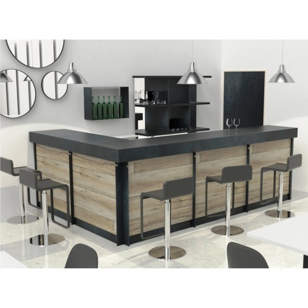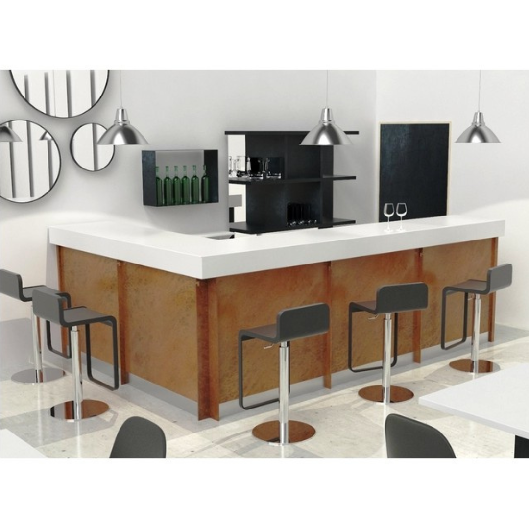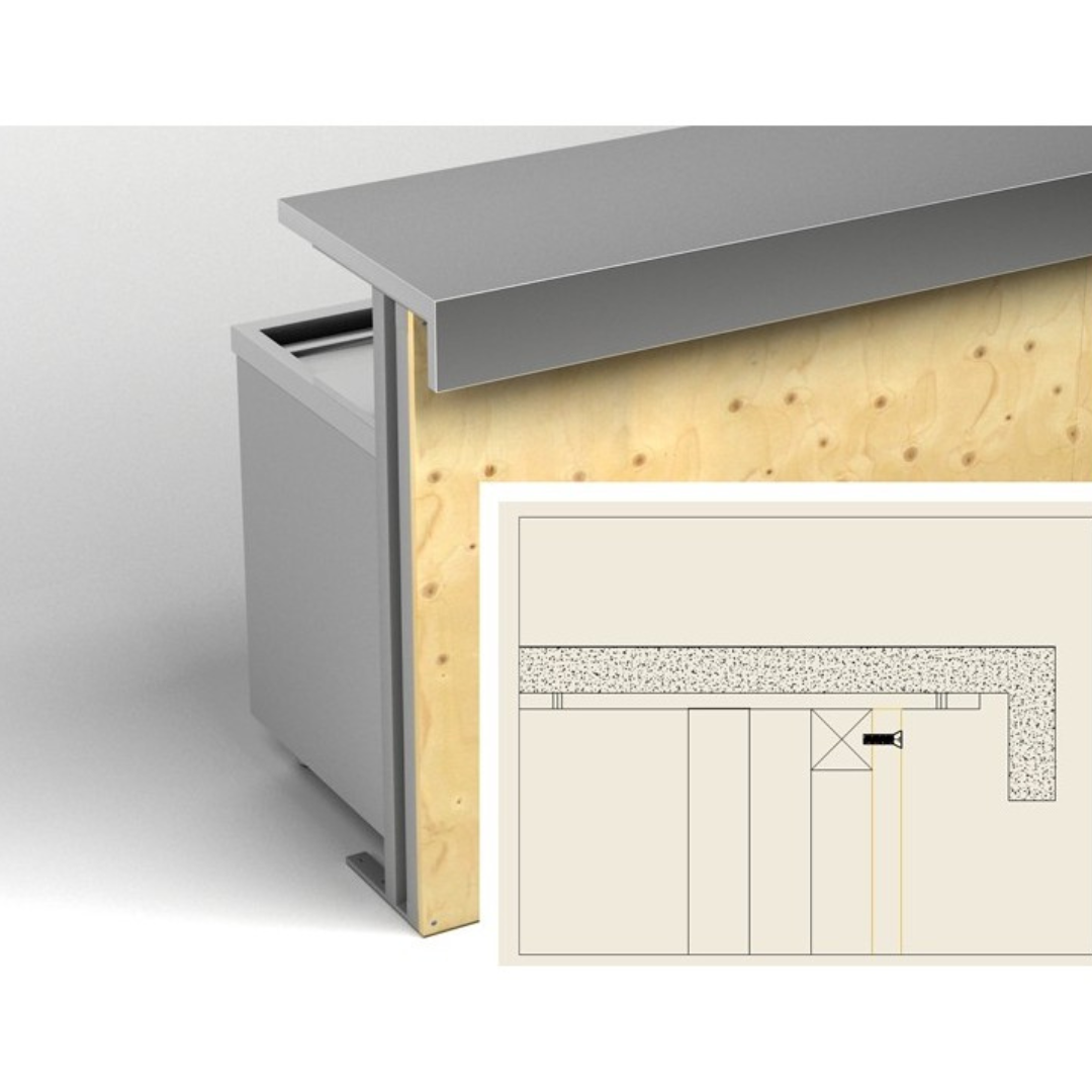 comptoir à barre en acier inoxydable intégré et renforcé en interne avec un agglomérat hydrophugo de 38 mm qui fournit la planéité nécessaire en grande longueur, élimine le son métallique. Avec l’enveloppe scotch ponçée et le polissage droit à l’avant droit.