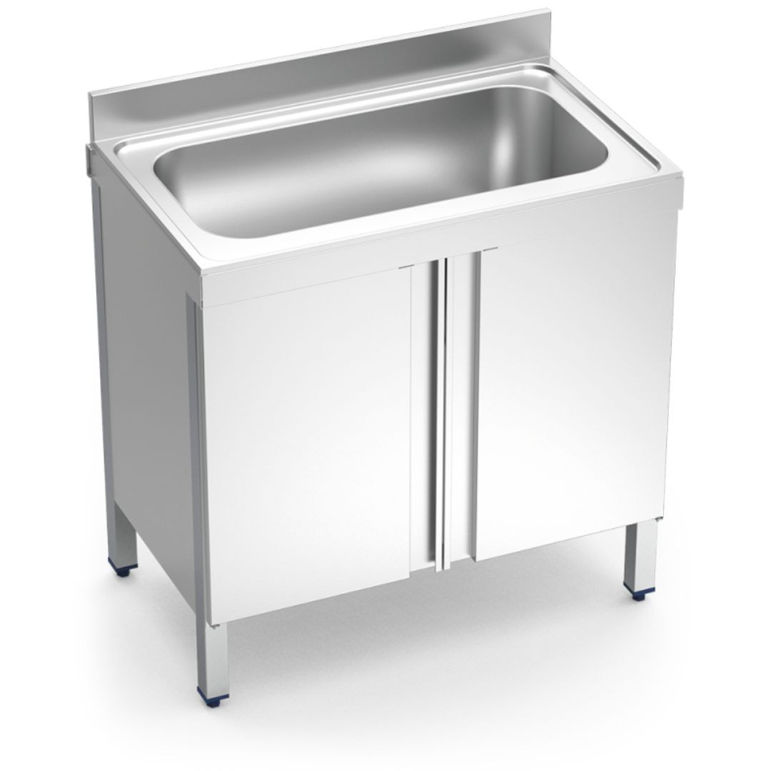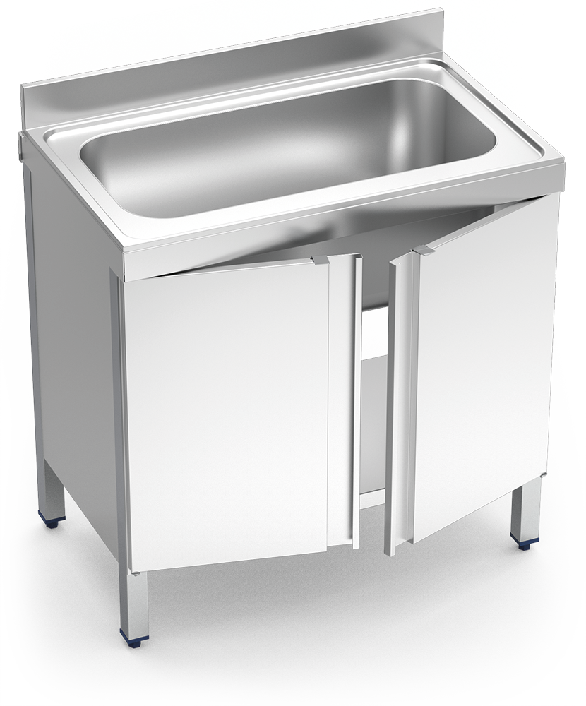 Éviers en acier inoxydable composés d’un godet de grande capacité et de support avec des portes pliantes.
