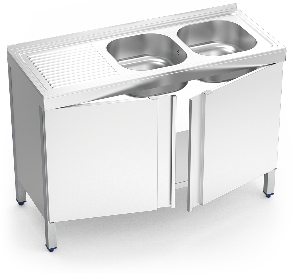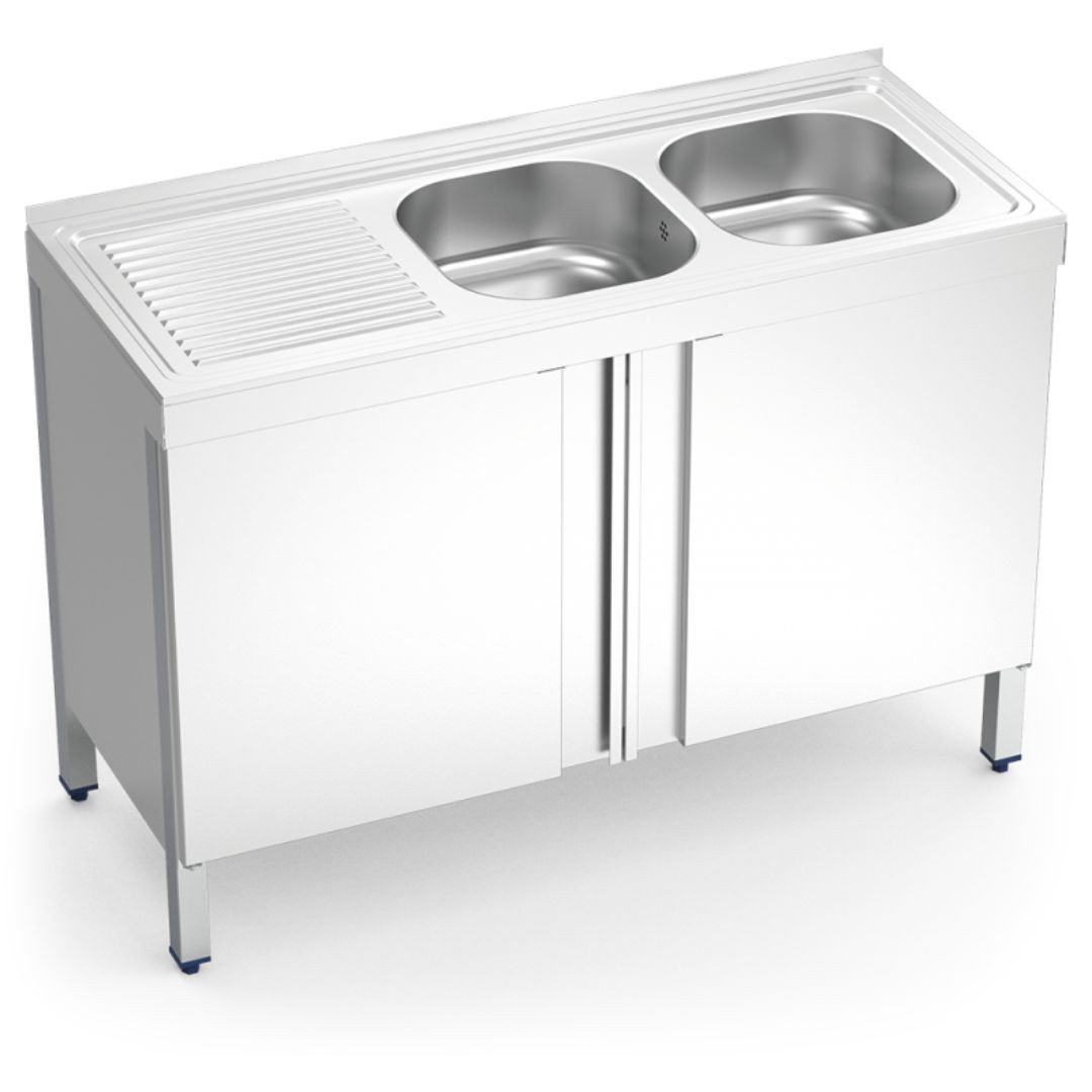 Éviers en acier inoxydable avec portes de support et de pliage composées de 2 seaux et de draineur gauche.