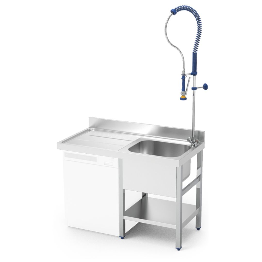 combinaison d’évier en acier inoxydable avec un espace de lave-vaisselle et un draineur à gauche avec une douche de série RD construite. Idéal pour laver les espaces dans les secteurs de l’hôtellerie et de la nourriture (hôtels, bars, restaurants, salles à manger, travailleurs …).