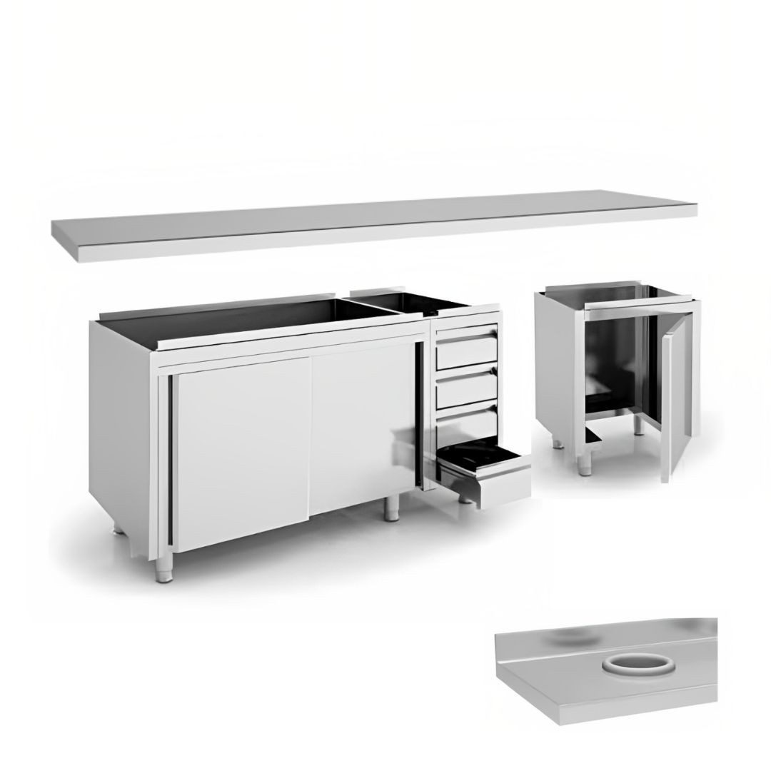 Meubles Composition linéaire en acier inoxydable composé de neutre fermé avec des portes coulissantes, un module de tiroir avec 4 tiroirs et un module de déchets avec un trou dans le comptoir pour les déchets.