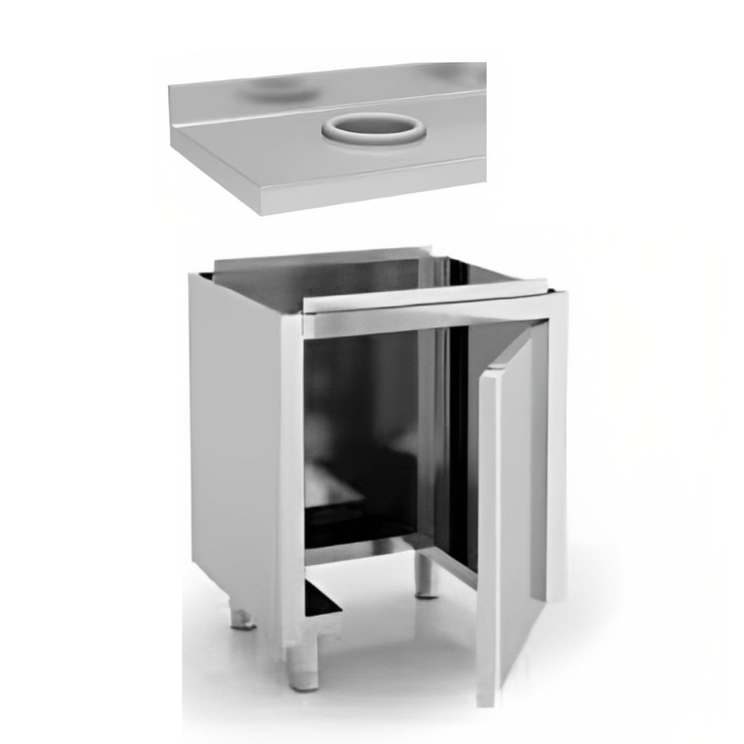 Meubles en acier inoxydable avec comptoir pour intégrer différents éléments modulaires neutres. Dans cette linéaire, un mobilier est intégré aux portes et aux tiroirs (avec une option pour différentes options de tiroir. Consulter) et le module de déchets avec cerceau perturbé en haut.