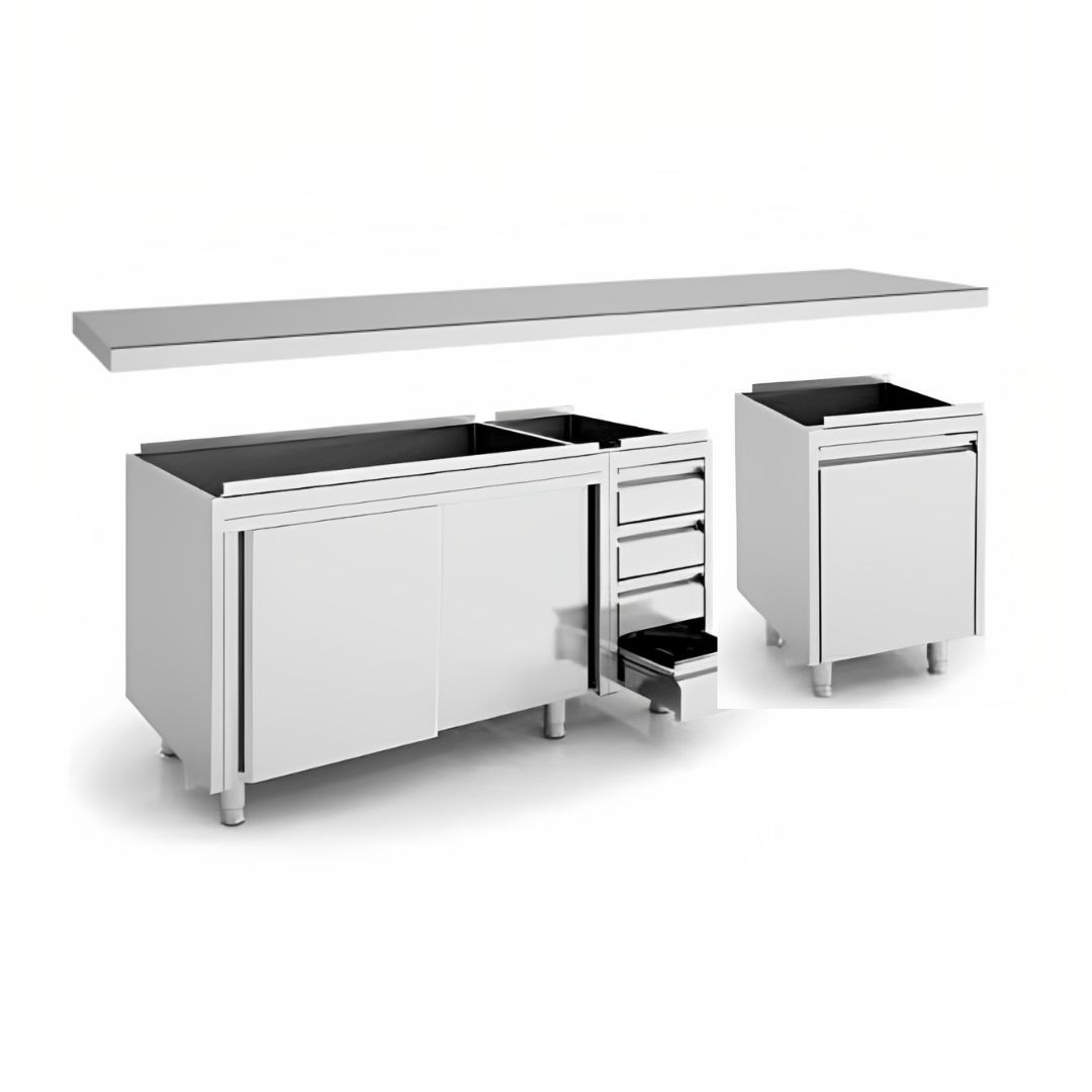 Composition de meubles neutres sans comptoir avec portes coulissantes et tiroir de 4 tiroirs + module de trémie + surface de comptoir inox.