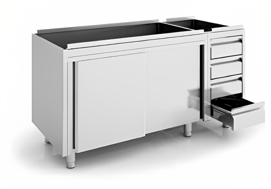 Meubles Composition linéaire en acier inoxydable composé de neutre fermé avec des portes coulissantes, un module de tiroir avec 4 tiroirs et un module de trémie.