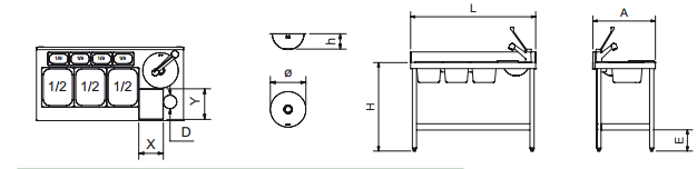 · 3 Cubetas GN 1/2 de 200 mm (non inclus).