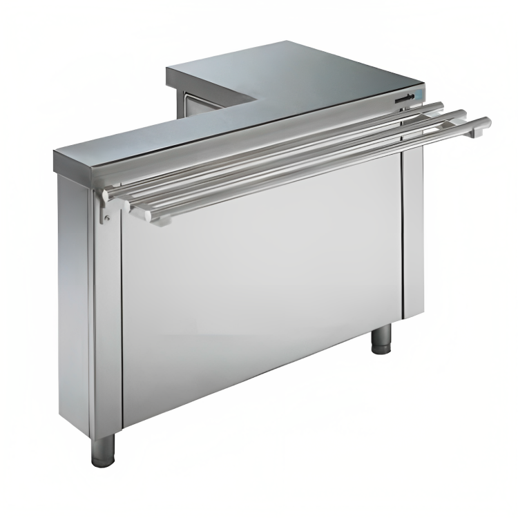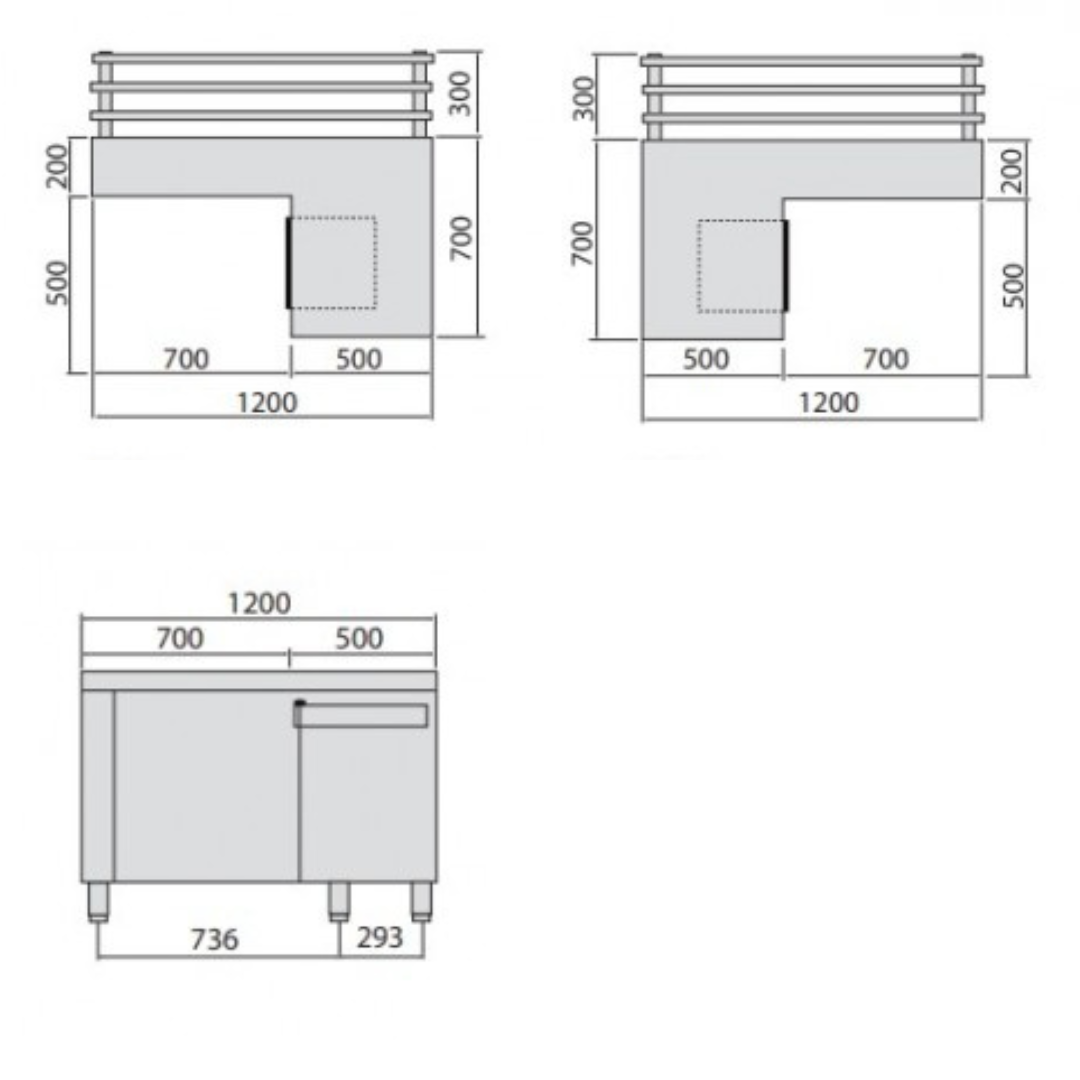 meubles en libre-service conçus pour le soutien d’une caisse enregistreuse, en acier inoxydable. Le trou pour la caisse enregistreuse peut aller à droite et à gauche. Mesures: 1200 x 700 x 850 mm.