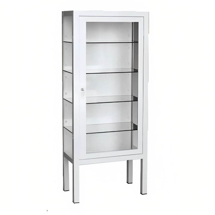SPARCASE avec 4 étagères en verre en acier en acier inoxydable ou avec revêtement époxy. Idéal pour les cliniques, les hôpitaux et les consultations du secteur clinique / sanitaire. Disponible dans différents matériaux.