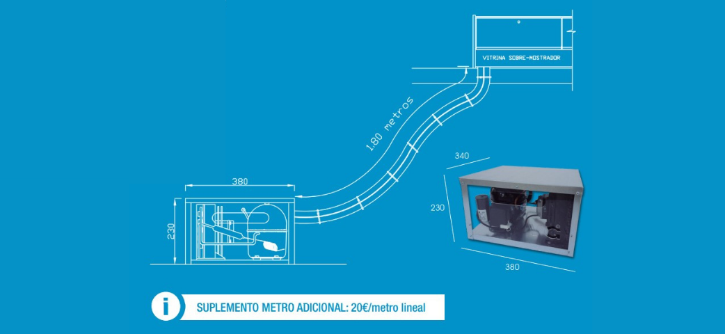 Modèles de groupe à distance: unité de condenseur à distance protégé avec feuille en acier galvanisée et panneaux de méthacrylate latéral pour la visualisation et la protection correctes des composants, entièrement connectés à la vitrine par un tube de 1,80 mètres avec une charge de gaz R-134A incluse.